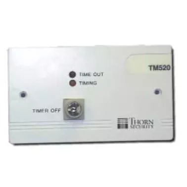 The TM520 provides an output that can be activated based on a delay time. If either the key-switch on the module is activated, or a predefined event within the control panel occurs then a times delay (set between 10 minutes and 21 hours 10 minutes) is started. When the delay reaches zero the TM520 output is activated. The unit sounds an internal buzzer and shows a red LED when the output is active, and shows a yellow LED when the timer is counting down.To provide a warning the delay is nearly over, the red LED and the buzzer will pulse 5 minutes before the end of the delay.